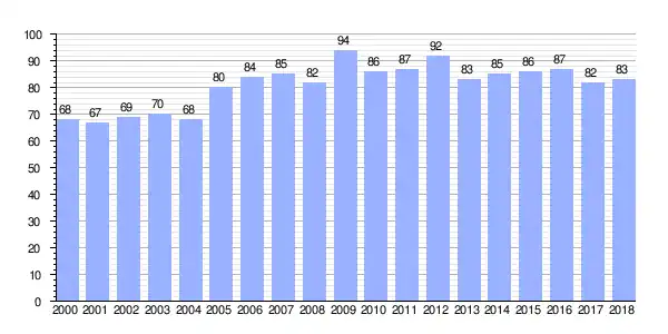 | Gráfica de evolución demográfica de Quintáns entre 2000 y 2018 |