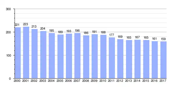 | Gráfica de evolución demográfica de Quintanilla de Babia[3] entre 2000 y 2017 |