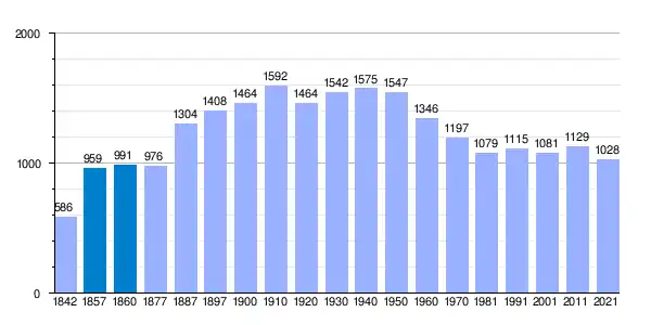 | Gráfica de evolución demográfica de Quintanilla de Onésimo[10] entre 1842 y 2021 |