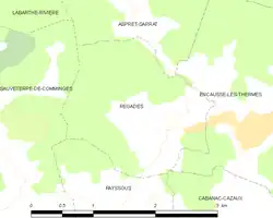 Régades es una población y comuna francesa, en la región de Mediodía-Pirineos, departamento de Alto Garona, en el distrito de Saint-Gaudens y cantón de Saint-Gaudens.