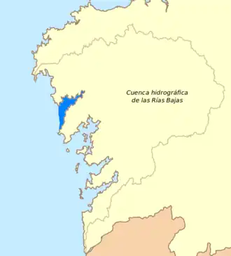 Las aguas de la ría comienzan en la playa de San Francisco, en Louro, por su orilla norte, y acaban en la playa de La Aguieira, en Puerto del Son, por su orilla sur. Entre estas se ubican las playas de As Gaivotas (en Miñortos), Testal (Noya), Broña (Outes), Medrón y Parameán (Esteiro), Cabanas (Tal) y O Castelo (Muros), entre otras.
