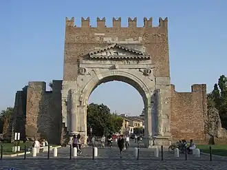 - Arco de Augusto – Es el más antiguo de los arcos de triunfo romanos que quedan; fue erigido en honor de Augusto en el 27 a. C. en el punto donde se encuentran la vía Flaminia y la vía Emilia; su función principal, además de servir como puerta urbica, era la de mantener la impresionante estatua de bronce del emperador Augusto, retratado mientras dirige un carruaje con cuatro caballos, desafortunadamente destruida. Junto con el Puente de Tiberio es hoy en día uno de los símbolos de la ciudad, tanto de aparecer en el emblema de la ciudad.