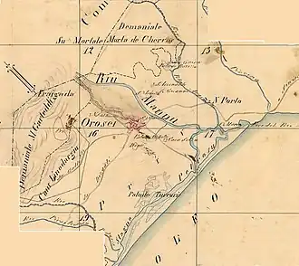 Antes de los diques construidos a principios del siglo XX, la llanura era un gran delta, parcialmente pantanoso, en el cual el río desembocaba en el mar dividido en dos ramales: uno, que coincidía aproximadamente con el cauce actual, conocido como "Riu Mannu" es decir, "Río Grande", y otro que bordeaba al noroeste la colina de Santa Lucía y se llamaba "Baddaranza", es decir, "Cedro".