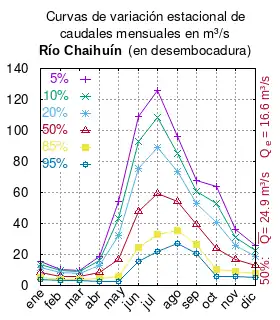 El caudal del río (en un lugar fijo) varía en el tiempo, por lo que existen varias formas de representarlo. Una de ellas son las curvas de variación estacional que, tras largos periodos de mediciones, predicen estadísticamente el caudal mínimo que lleva el río con una probabilidad dada, llamada probabilidad de excedencia. La curva de color rojo ocre (con ) muestra los caudales mensuales con probabilidad de excedencia de un 50%. Esto quiere decir que ese mes se han medido igual cantidad de caudales mayores que caudales menores a esa cantidad. Eso es la mediana (estadística), que se denota Qe, de la serie de caudales de ese mes. La media (estadística) es el promedio matemático de los caudales de ese mes y se denota .