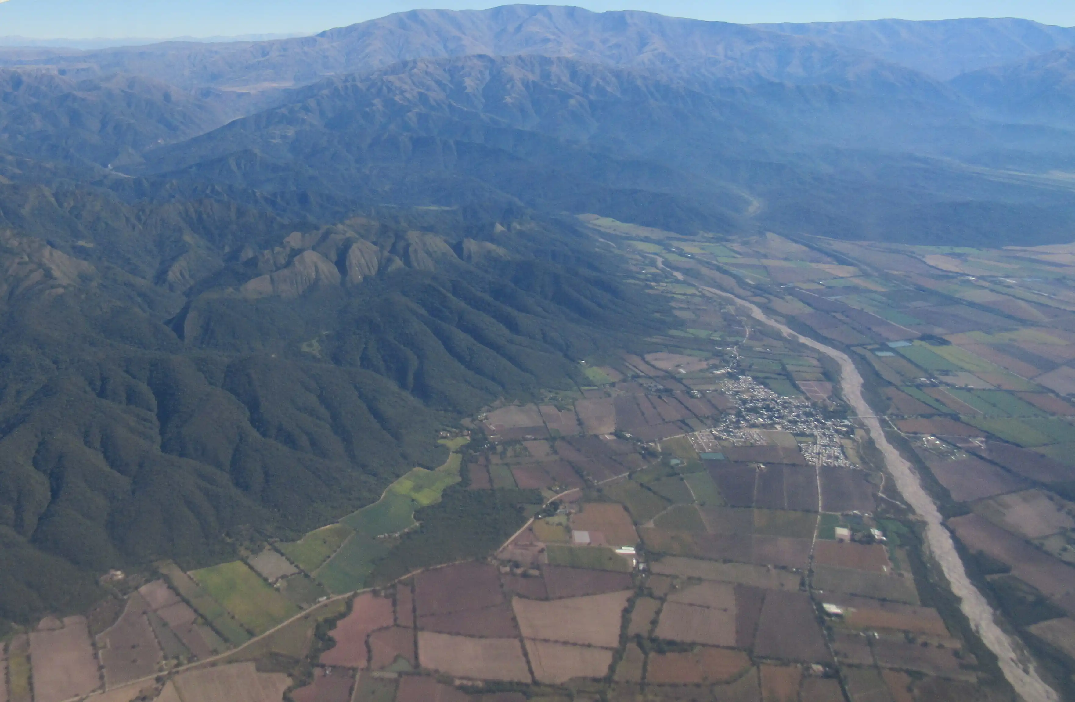 ![]() Río Chicoana a la derecha atravesando la localidad homónima. Arriba a la izquierda se puede ver la Quebrada del Escoipe | ||