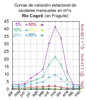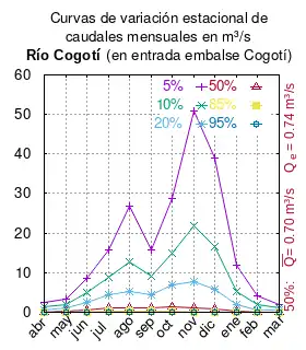 El caudal del río (en un lugar fijo) varía en el tiempo, por lo que existen varias formas de representarlo. Una de ellas son las curvas de variación estacional que, tras largos periodos de mediciones, predicen estadísticamente el caudal mínimo que lleva el río con una probabilidad dada, llamada probabilidad de excedencia. La curva de color rojo ocre (con ) muestra los caudales mensuales con probabilidad de excedencia de un 50 %. Esto quiere decir que ese mes se han medido igual cantidad de caudales mayores que caudales menores a esa cantidad. Eso es la mediana (estadística), que se denota Qe, de la serie de caudales de ese mes. La media (estadística) es el promedio matemático de los caudales de ese mes y se denota .