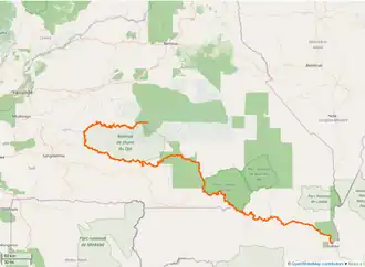 El río Dja nace al sur de la localidad de Abong Mbang (con una población estimada en 2004 de 19 000 habitantes), en la región del Este. Primero se dirige en dirección oeste y luego, tras casi 200 km, gira y se vuelve al este, describiendo una cerrada curva que supone el límite de la Reserva Zoológica de Dja, declarada en 1987 por la Unesco como Patrimonio Mundial de la Humanidad (5260 km²).