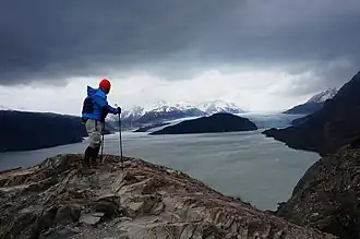 ![]() Un caminante observa desde el otro lado del lago la muralla del glaciar Grey. | ||