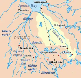 - ↑ a b c d e f «Rivière Harricana» (en francés). Commission de toponymie du Québec. Archivado desde el original el 3 de marzo de 2016. Consultado el 18 de noviembre de 2008.