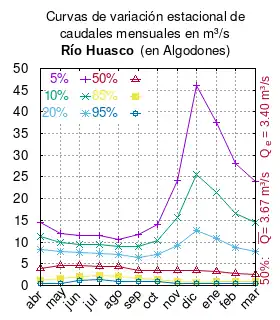 El caudal del río (en un lugar fijo) varía en el tiempo, por lo que existen varias formas de representarlo. Una de ellas son las curvas de variación estacional que, tras largos periodos de mediciones, predicen estadísticamente el caudal mínimo que lleva el río con una probabilidad dada, llamada probabilidad de excedencia. La curva de color rojo ocre (con ) muestra los caudales mensuales con probabilidad de excedencia de un 50%. Esto quiere decir que ese mes se han medido igual cantidad de caudales mayores que caudales menores a esa cantidad. Eso es la mediana (estadística), que se denota Qe, de la serie de caudales de ese mes. La media (estadística) es el promedio matemático de los caudales de ese mes y se denota .