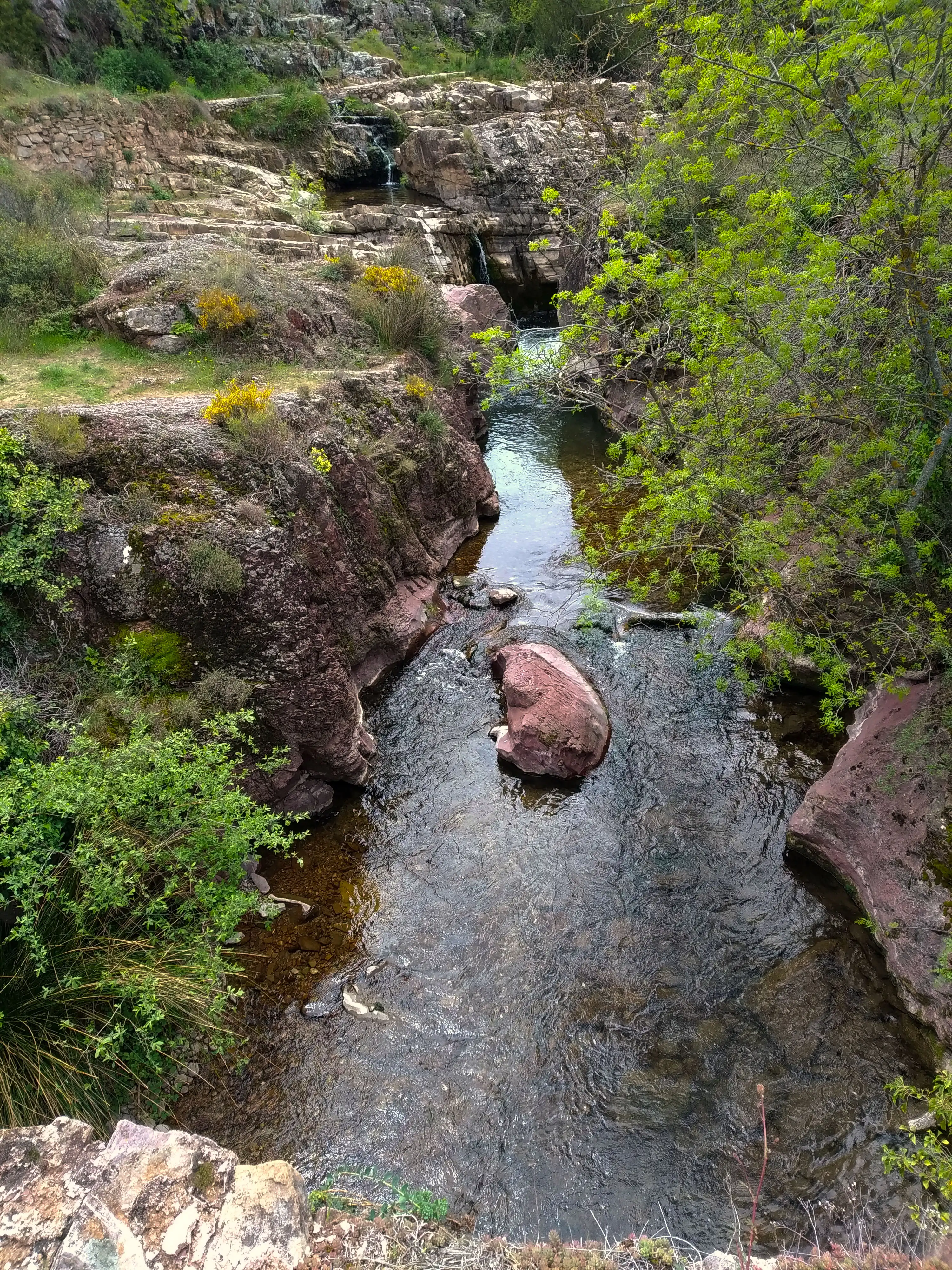 ISUELA: r. que se forma en el térm. de Purujosa, prov. de Zaragoza, part. jud. de Borja, de una fuente caudalosa que nace junto á un molino harinero, fertiliza sobre 10 cahizadas de tierra, y á la 1/2 leg. del pueblo se oculta toda el agua para volver á salir 1 hora mas abajo formando la fuente de Calcena, cuya pobl. queda á la izq. Hasta esta v. lleva su curso hacia el E., riega en ella una corta vega de 60 cahizadas, manteniendo al mismo tiempo un molino harinero, una fáb. de papel de estraza, un batan y otra fáb. de paños ordinarios, y variando entonces su direccion hacia el SE., que ya no abandona, corre por las inmediaciones de Trasovarés en donde fertiliza 50 cahices y da movimiento á un molino harinero y un batan: se introduce luego en el part. de Calatayud por Tierga y Mesones, cuyas v. asi como Nigüella, quedan á la izq. y en las que da movimiento á algunos molinos harineros, y un poco antes de llegar á Arandiga, se confunde con el r. Aranda (V.), los cuales asi unidos pasan al térm. de Chodes, part. de la Almunia, donde desembocan en el Jalon.(Madoz, 1847, p. 466)