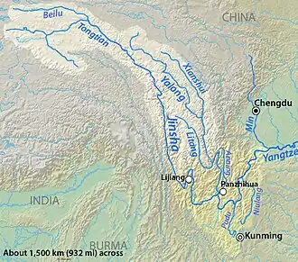 Como el río Jinsha, fluye hacia el sur a través de una profunda garganta paralela a las gargantas similares de los ríos Mekong superior y Salween superior, de los que está separado por las montañas Ningjing. Forma la frontera occidental de Sichuan a lo largo de unos 400 km y luego desemboca en la provincia de Yunnan. Tras una gran curva de 320 km al norte de la prefectura autónoma de Dali Bai, el Jinsha gira hacia el noreste, formando el límite provincial entre Sichuan y Yunnan hasta que se une al río Min en Yibin, en Sichuan, para formar el Yangtsé.