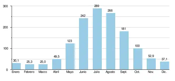 Estas diferencias pueden ser más importantes a lo largo de los años: así, en los 40 años del estudio, el caudal mensual mínimo ha sido 14.7 m³/s en febrero de 1957, mientras que el caudal mensual máximo fue de 581 m³/s en julio de 1952.