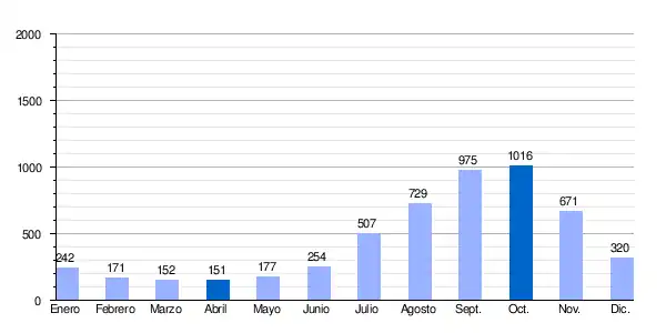 | Caudal medio mensual del río Kotto en la estación hidrométrica de Kembe (en m³/s. Datos calculados en el período de 25 años, 1948-1973) |