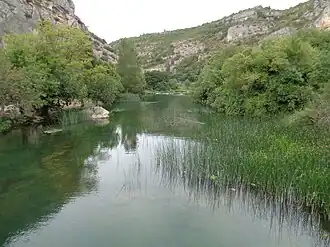 El río nace cerca de la frontera de Croacia con Bosnia y Herzegovina, al pie de la montaña Dinara. Tras serpentear por el cañón de Krčić, se adentra en el valle cárstico de Knin a través de la cascada de Krčić, de 25 m. Al pie de la segunda de ellas, llamada cascada de Topoljski, hay un manantial en una cueva con 150 m de paso.[2] A continuación, el río fluye por el valle, donde se alimenta del Kosovčica por la izquierda y del Orašnica y el Butižnica por la derecha, pasando la Fortaleza de Knin entre los dos últimos en el camino, y entrando en el cañón principal