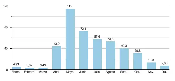 El caudal medio mensual observado en febrero (mínimo de estiaje) es de 3.37 m³/s, menos de un 3% del caudal medio del mes de mayo, 115 m³/s, lo que subraya la importante amplitud de las variaciones estacionales. Durante la duración del periodo de observación, el caudal mensual mínimo registrado ha sido de 0.73 m³/s en marzo de 1964, mientras que el máximo ha sido 267 m³/s en mayo del 2966 y en mayo de 1987.