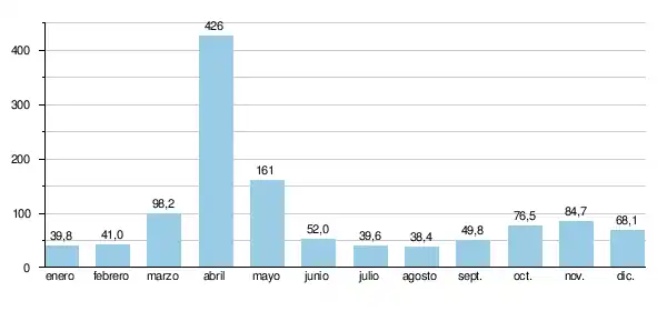 El caudal medio mensual en agosto (mínimo estiaje) fue de 38,4 m³/s, o menos del 10% de la media del mes de abril (la mayor del año), que hace resalta la amplitud de las variaciones estacionales. En el período de observación de 63 años, el caudal mínimo mensual fue 3,38 m³/s (diciembre de 1939), mientras que el caudal máximo mensual ascendió a 750 m³/s (abril de 1915).