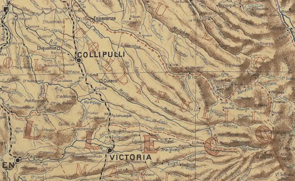 Malleco (Río).-—En la provincia á que presta su nombre. Nace de una pequeña laguna de la base de los Andes é inmediata hacia el O. del volcán de Lonquimay, y corre en su primeras parte por entre serranías y bosques de esa cordillera en dirección al O., y luego hacia el NO. por terrenos más bajos hasta su confluencia con el río que pasa por la ciudad de Angol, lo que verifica á cuatro kilómetros al N. de ella, al cabo de unos 75 de curso ligeramente pando; formando esa reunión el río Vergara. Es de caudal poco abundante y lecho profundo. Junto á Collipulli lo atraviesa un monumental viaducto de ferrocarril de 350 metros de largo y 98 de alto sobre la línea sinclinal, construido por el injeniero V. A. Lastarria é inaugurado por el Presidente Balmaceda el 26 de octubre de 1890. Sus riberas, fértiles y amenas, antes ocupadas por indios bravíos, contíenen al presente: en el lado norte las poblaciones de Collipulli, Curaco, Mariluán, Perasco, y en el del sur á Chiguaihue, Cancura, Lolenco, &c. También existió en su margen sur cerca de su término la primitiva ciudad de Angol. El nombre significa agua de arcilla blanquizca, formado de malle, esa especie de tierra, y de co, agua.