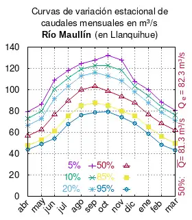 El caudal del río (en un lugar fijo) varía en el tiempo, por lo que existen varias formas de representarlo. Una de ellas son las curvas de variación estacional que, tras largos periodos de mediciones, predicen estadísticamente el caudal mínimo que lleva el río con una probabilidad dada, llamada probabilidad de excedencia. La curva de color rojo ocre (con ) muestra los caudales mensuales con probabilidad de excedencia de un 50%. Esto quiere decir que ese mes se han medido igual cantidad de caudales mayores que caudales menores a esa cantidad. Eso es la mediana (estadística), que se denota Qe, de la serie de caudales de ese mes. La media (estadística) es el promedio matemático de los caudales de ese mes y se denota .