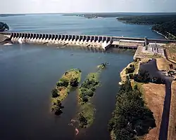 - en Oklahoma, una presa en Langley que da lugar al mayor embalse del río Neosho, el Gran Lago o' the Cherokees (188 km²). Una presa cerca de Locust Grove (1366 hab.) forma el embalse del lago Hudson (también conocido como embalse Markham Ferry), y una presa aguas arriba de Fort Gibson formas el embalse de Fort Gibson.
