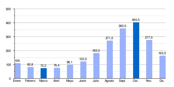 El flujo mensual medio del Ouaka medido en la estación hidrológica en Bambari, a unos 230 km por encima de la desembocadura en el Ubangi en m³/s (1952-1976).[3]