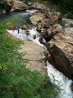 Es posiblemente su mayor atractivo. Se accede desde la RN 3 desviándose por un camino secundario de 2,5 km el cual recorre la margen derecha del río, entre grandes turbales y áreas de pastizales antrópicos. Al final de este camino se encuentra un estacionamiento vehicular. Desde allí, por un corto sendero pedestre que remonta el curso fluvial se llega a los saltos.[5]