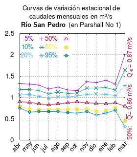 El caudal del río (en un lugar fijo) varía en el tiempo, por lo que existen varias formas de representarlo. Una de ellas son las curvas de variación estacional que, tras largos periodos de mediciones, predicen estadísticamente el caudal mínimo que lleva el río con una probabilidad dada, llamada probabilidad de excedencia. La curva de color rojo ocre (con ) muestra los caudales mensuales con probabilidad de excedencia de un 50%. Esto quiere decir que ese mes se han medido igual cantidad de caudales mayores que caudales menores a esa cantidad. Eso es la mediana (estadística), que se denota Qe, de la serie de caudales de ese mes. La media (estadística) es el promedio matemático de los caudales de ese mes y se denota .