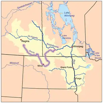 El río Souris se origina en Yellow Grass Marshes, al norte de Weyburn, en la parte suroeste de la provincia canadiense de Saskatchewan, después fluye al sureste ingresando a Dakota del Norte, donde vira al norte para volver a entrar a Canadá, uniéndose al río Assiniboine en Manitoba después de haber recorrido unos 700 km.