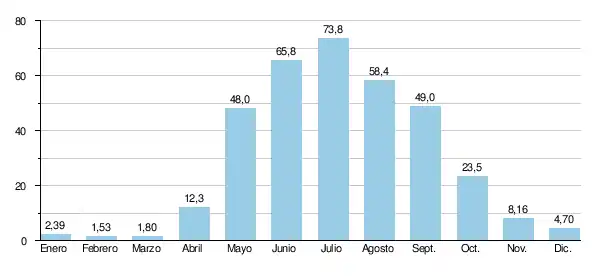 El caudal medio mensual observado en febrero (mínimo de estiaje) es de 1,53 m³/s , lo que supone solamente un 2 % del caudal medio del mes de julio (73,8 m³/s), lo que testimonia la amplitud muy elevada de la variaciones estacionales. En los 51 años del estudio, el caudal mensual mínimo ha sido de 0,001 m³/s (un litro) en marzo de 1983, mientras que el caudal mensual máximo se elevó a 187 m³/s en julio de 1971.