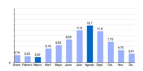 El caudal medio mensual observado en marzo (mínimo de estiaje) es de 2,02 m³/s, lo que representa cerca del 15% del caudal medio del mes de agosto (13,7 m³/s), lo que testimonia la amplitud moderada de las variaciones estacionales.