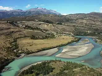 - Salto (Rio del) 47° 50' 72° 34' Nace en las faldas de macizos nevados, corre hacia el N en un valle ocupado por ñadis, alternados con ojos de agua i pequeñas lagunas, en medio de las cuales busca camino en innumerables serpentinas, lleva aguas, correntosas, de color de barro i está bordeado por estensas playas i pampas de coirón; los. numerosos montones de palos secos amontonados en las orillas de su cauce, dan testimonio de los efectos de sus avenidas. Presenta un salto, visible desde gran distancia, pasa cerca de la laguna de El Juncal, de la que queda separado por una lengua baja ríe tierra de un kilómetro de ancho, a traves de la cual, en ciertas épocas del año, las aguas del rio se desparraman i penetran en la laguna, concluye por afluir a la márjen S del curso superior del rio Baker, con un ancho de 60 m, baña terrenos pastosos i constituye uno de sus principales tributarios; sus riberas ofrecen unos 200 km2 de terrenos aprovechables para el cultivo i la ganadería i en ellas se observan fuertes escarchas aun en los meses de verano, en los que el termómetro suele bajar de 0 °C. 111. ii, p. 377, 389, 391 i 397; 121, p. 47 i 76; 134; 154; i 156.