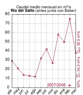 Finalmente el río del Salto cae al valle del río Baker desde un alto umbral originando una gran catarata que lo hace acreedor a su nombre.