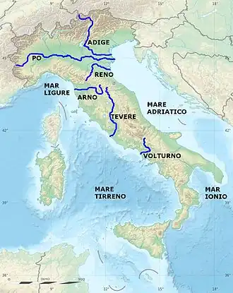 Los ríos de Italia, en comparación con los ríos de otras regiones europeas, son cortos. Esto se debe a que el país es una península estrecha, dividida por los Apeninos en dos vertientes.
