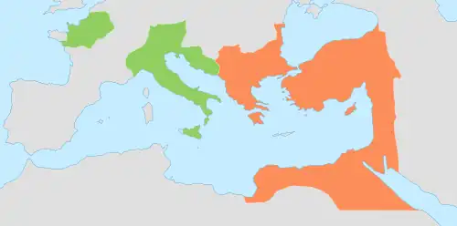 En la época del emperador Diocleciano (r. 284-305), se había impuesto la idea de que el Imperio romano había crecido tanto que sería mejor administrado por dos emperadores cogobernantes, en lugar de uno. Tras varias divisiones a lo largo del siglo IV, el imperio quedó firme y permanentemente dividido en una esfera occidental y otra oriental de administración imperial a partir de la muerte del emperador Teodosio I (r. 379-395) en el año 395 en adelante.[7] Aunque los historiadores modernos suelen utilizar los términos Imperio romano de Occidente e Imperio romano de Oriente para describir la nueva situación política, los propios romanos nunca consideraron que el imperio estuviera formalmente dividido, sino que lo seguían viendo como una sola unidad, aunque la mayoría de las veces con dos gobernantes en lugar de uno.[8] En el transcurso del siglo V, el imperio occidental experimentó un periodo de decadencia continua. No sólo muchos de los gobernantes de Occidente carecían en general de competencia, sino que además se enfrentaban a enormes problemas. En comparación con las provincias orientales, gran parte del oeste era más rural, con menos gente y una economía menos estable. Un número creciente de invasiones y asentamientos bárbaros germánicos en todo el oeste no hizo más que agravar estos problemas.[7]