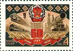 ![]() Sello postal en honor al 60 aniversario de la República Autónoma Soviética de Komi