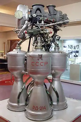 El RD-214 (índice GRAU 8D59) era un motor de cohete líquido, quemaba AK-27I (una mezcla de 73% de ácido nítrico y 27% de N 2 O 4 + yodo pasivante y TM-185 (una mezcla de queroseno y gasolina) en el ciclo del generador de gas.[1][2] Como en el caso de muchos motores con influencia V-2, la única turbina era impulsada por el vapor generado por la descomposición catalítica de H2O2. También tenía cuatro cámaras de combustión y el control vectorial se lograba mediante paletas refractarias inmersas en el escape de la tobera.[3]
