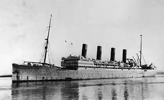 ![]() El RMS Windsor Castle fotografiado antes de su remodelación de 1937, con su diseño original, hacia mediados de los años 1920 | ||