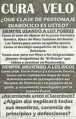 - ↑ Fuego Simondet, Javier (22 de abril de 2016). «Panfletos e infiltrados, los aprietes al cura de Merlo defendido por el Papa». La Nación. Consultado el 25 de abril de 2016.