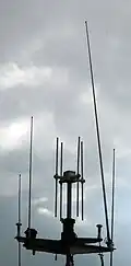 - En el mar, los barcos de alta mar están equipadas, en la frecuencia 121,5 MHz, un buscador de localización de emergencia.[5] Las cuatro antenas (derecha) de la baliza de emergencia de 121,5 MHz para el efecto Doppler se alimentan uno tras otro para determinar la dirección de la estación en peligro.