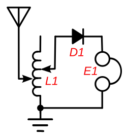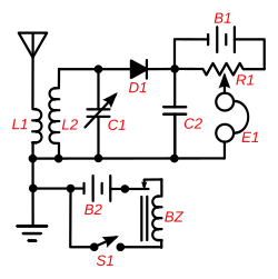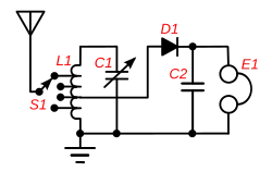 El circuito sintonizador, que consta de una bobina y de un condensador conectados entre sí, actúa como un resonador, que trabaja de forma similar a un diapasón cuando se afina un instrumento musical.[61]​ Los impulsos eléctricos inducidos en la antena por las ondas de radio, fluyen rápidamente hacia atrás y adelante entre las placas del condensador a través de la bobina. El circuito tiene una alta impedancia respecto a la frecuencia de la señal de radio deseada, pero una baja impedancia para todas las demás frecuencias.[62]​ Por lo tanto, las señales en las frecuencias no deseadas pasan a través del circuito sintonizado a tierra, mientras que la frecuencia deseada pasa a través del detector (diodo), estimula el auricular y finalmente es posible escucharla. La frecuencia de la emisora "recibida" es la frecuencia de resonancia f del circuito sintonizador, determinada por la capacitancia C del condensador y por la inductancia L de la bobina:[63]