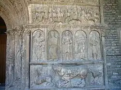Ramón Berenguer se ocupó en engrandecer, sostener y proteger el monasterio de Ripoll donde estaba enterrado su padre Ramón Berenguer III y ese fue el lugar que él mismo escogería para ser sepultado después de su muerte.[22][177] Precisamente durante su «reinado» fue cuando se inició (y probablement se terminó) el cuerpo esculpido que enmarca la puerta de entrada, que, según Concepció Peig, «habría sido diseñada con su visto bueno, para mantener la memoria y presencia de su padre, Ramon Bereguer III, y de él mismo» —«su programa iconográfico establece paralelismos entre las gestas del pueblo de Dios y las de los dos último condes»—, ya que siguiendo las costumbres funerarias del siglo XII en Occidente padre e hijo habrían sido enterrados en la puerta de la iglesia y no dentro (las fuentes documentales confirman la existencia de cinco sepulcros a los pies de la portada, que todavía eran visibles a principios del siglo XIX). Peig plantea como hipótesis que el lugar exacto donde habría sido enterrado inicialmente Ramón Berenguer IV (tras la reformas llevadas a cabo después del terremoto de 1428 el sepulcro habría pasado al interior de la iglesia) fue a los pies del lado derecho de la portada, donde aparecen tres personajes no identificados, pero que Peig cree que se trata de él mismo (izquierda), del obispo Oleguer (centro) y de su padre (derecha).[178]