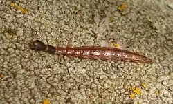 De aquí surgen las larvas, que son de tipo campodeiforme, aplanadas, muy activas y de vida terrestre. Su primera pigmentación es amarillenta, con las piezas bucales ya muy desarrolladas (aunque aún no son muy fuertes), las antenas diferenciadas y las patas cortas y robustas. En este primer estadio larvario, las larvas permanecen unidas, y no muestran gran movilidad, sino que frecuentemente mordisquean las cubiertas de los huevos. No se sabe exactamente si se alimentan de huevos con embriones en su interior ni cuál es el tipo de alimentación de este periodo. Este primer estadio dura únicamente unos pocos días. En el segundo estadio larvario se desarrollan aún más las mandíbulas, antenas y patas y la cabeza y el protórax resaltan por su fuerte esclerotización. Son individuos mucho más móviles, ya que consiguen su alimento de manera autónoma y viven aisladas las unas de la otras. Este segundo estadio larvario también se mantiene por unos pocos días. Los siguientes estadios varían según la especie, edad, la cantidad de alimento disponible y de la temperatura, durando desde unas pocas semanas hasta varios meses, pero a medida que la fase es más avanzada, los intervalos entre una muda y la muda posterior se van haciendo cada vez más largos. Además de esto, no hay un número de estadios larvales predefinido, ya que depende de la especie, de la cantidad de alimento disponible y la temperatura, pero generalmente encontramos entre 10-16, lo que suele durar aproximadamente dos años. Las larvas son depredadoras de una gran variedad de artrópodos.