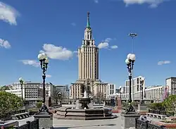 En primer plano, el edificio del Ministerio de Asuntos Exteriores; en segundo plano, a lo lejos, también se aprecia el edificio de la Universidad Estatal de Moscú.