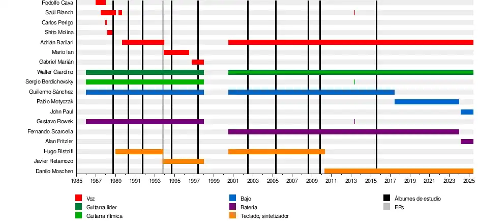 Desde sus comienzos, la banda ha sufrido varios cambios en su formación, siendo Walter Giardino el único miembro original que permanece hasta hoy.[9] Su alineación actual está formada por Walter Giardino (guitarra), Adrián Barilari (voz), Alan Fritzler (batería), Danilo Moschen (teclados) y Juan Pablo Massanisso (bajo).