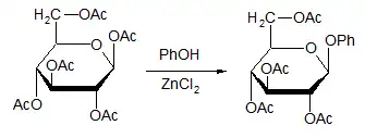 Una variante de la reacción de Koenigs–Knorr es el método de Helferich, en donde se conecta un monosacárido poliacetilado a un fenol en presencia de un haluro de metal (ZnCl2, FeCl3). Se puede utilizar ácido p-toluenosulfónico como catalizador:[5]