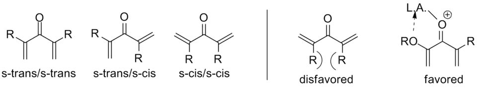 Como se indicó anteriormente, se conocen variantes que se desvían de esta plantilla; lo que designa una ciclización de Nazarov en particular es la generación del catión pentadienilo seguido del cierre del anillo electrocíclico a un catión oxialilo. Para lograr esta transformación, la molécula debe estar en la conformación s-trans/s-trans, colocando los grupos vinilo en una orientación adecuada. La propensión del sistema a entrar en esta conformación influye drásticamente en la velocidad de reacción, con sustratos α-sustituidos que tienen una mayor población del confórmero requerido debido a la tensión alílica. La coordinación de un sustituyente α donador de electrones por parte del catalizador también puede aumentar la velocidad de reacción al reforzar esta conformación.[2]