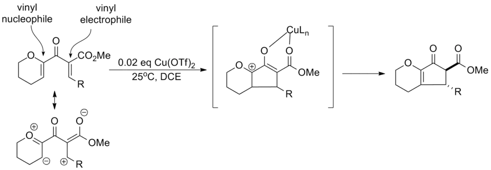 Basándose en los efectos de los sustituyentes compilados en varios ensayos de la reacción, la profesora Alison Frontier de la Universidad de Rochester desarrolló un paradigma para las ciclizaciones de Nazarov 'polarizadas' en las que se utilizan grupos donantes y aceptores de electrones para mejorar la selectividad general de la reacción. La creación de un nucleófilo de vinilo y un electrófilo de vinilo eficaces en el sustrato permite la activación catalítica con triflato de cobre y la eliminación regioselectiva. Además, el grupo atractor de electrones aumenta la acidez del protón α, lo que permite la formación selectiva del epímero trans-α mediante el equilibrio.[14]