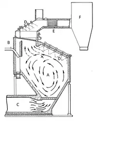 El método de alimentar la entrega varía dependiendo de su fase. Los sólidos pueden suministrarse utilizando un transportador B, mientras que los fluidos se vaporizan y se rocía directamente en el RF. Luego se pone en contacto con un gas caliente de circulación continua que se introdujo en la sección C. Este gas de circulación continua interactúa a través de la cámara con la alimentación entrante, y las superficies de las partículas generan sales insolubles como resultado de las reacciones. La mezcla del producto se separa a través de E, donde una salida de escape emite productos gaseosos. La temperatura de esta corriente se controla mediante un refrigerante emitido por las boquillas de rociado D del recipiente.