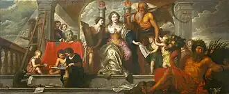 Poco después de la fundación de la Academia de Amberes, se realizaron tres grandes cuadros para su sala de reuniones. Antverpia, Nutrix Painters, de Theodoor Boeyermans (1665; 188 x 454 cm), promueve el pasado artístico reciente de la ciudad. Los retratos de Peter Paul Rubens y Anton van Dyck vigilan a los estudiantes mientras practican las artes. En el centro se encuentra la alegórica Antverpia pictorum nutrix. Chronos acompaña a otros jóvenes estudiantes que presentan sus obras de arte. El dios del río Scaldis, personificación del río Escalda de Amberes, simboliza con su cornucopia la riqueza y la abundancia del patrimonio artístico de la ciudad.