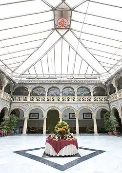 El inmueble, que se ubica en el solar antes perteneciente al convento de Nuestra Señora de las Nieves, convento de monjas recoletas agustinas desamortizado en 1836 y que cuenta con una superficie de 4395 metros cuadrados, organiza sus dependencias en torno a grandes patios: el patio central, antiguo claustro conventual de estilo manierista, un patio jardín y un tercer patio trasero. El patio central se estructura en dos plantas con galerías en sus cuatro frentes. En la planta baja presenta arquerías con arcos de medio punto sobre columnas toscanas y en la planta alta arcos carpaneles sobre columnas toscanas de menor tamaño y balaustradas de piedra decorada con motivos serlianos. Las enjutas de los arcos y el zócalo de la galería inferior están decorados con cerámica sevillana del siglo XIX. La montera que lo cubre fue realizada en el siglo XXI.[1]